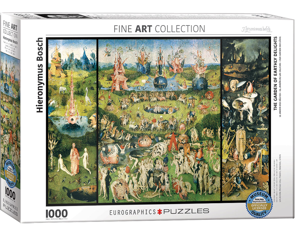 Este rompecabezas de 1000 piezas captura la icónica obra de Hieronymus Bosch, una pintura llena de simbolismo y detalles fascinantes. Representa tres escenas: el Paraíso, la vida terrenal y el Infierno, con una composición única que ha intrigado a historiadores y amantes del arte por siglos.