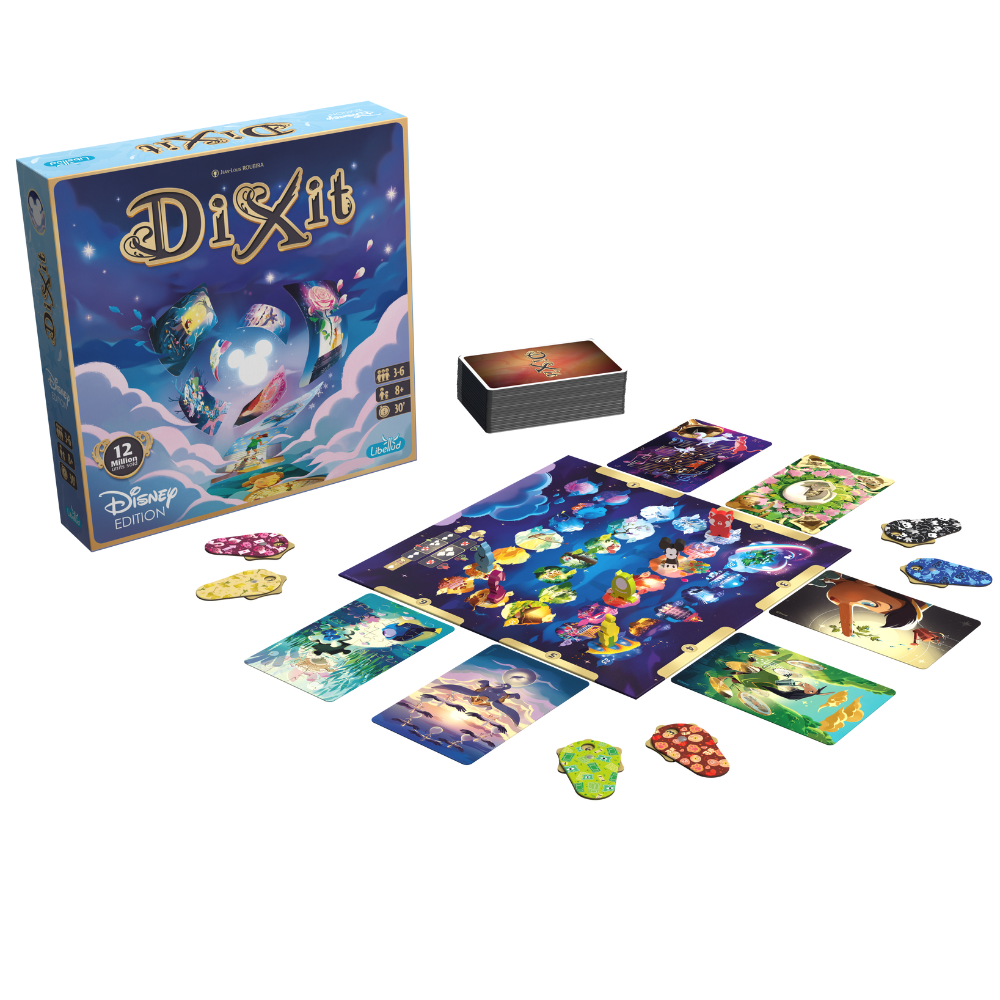 Dixit Disney es una versión autónoma y temática del juego Dixit, que se centra en las imágenes icónicas de las películas de Disney y Pixar. El objetivo y la mecánica son los mismos (adivinar la carta del narrador a partir de una pista), pero las cartas tienen ilustraciones exclusivas del universo Disney. Su dificultad es Fácil, aunque las pistas pueden ser más específicas a la cultura pop Disney.