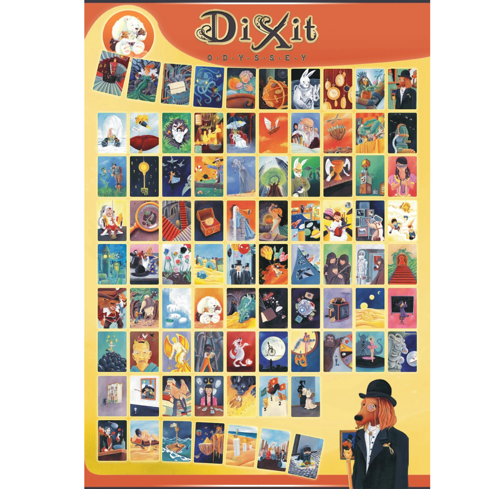 Dixit Odyssey es una versión autónoma del juego Dixit, que también funciona como una gran expansión. Es un juego de Creatividad, Narrativa e Interpretación de Imágenes. A diferencia de la versión original, Odyssey permite jugar hasta 12 jugadores, incluyendo un nuevo tablero y componentes para esta capacidad. El objetivo y la mecánica son los mismos: adivinar la carta del narrador a partir de una pista.