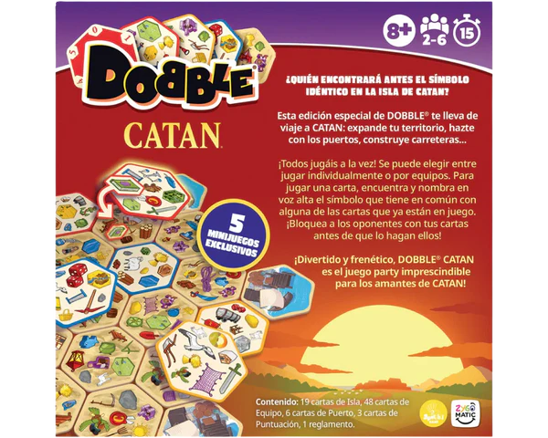 El exitoso juego de velocidad visual Dobble se une al mundo de la estrategia de CATAN en esta edición especial de la editorial Asmodee. El juego mantiene la esencia de encontrar el símbolo idéntico entre dos cartas, pero ahora con ilustraciones temáticas basadas en los recursos y elementos del famoso juego de colonos.