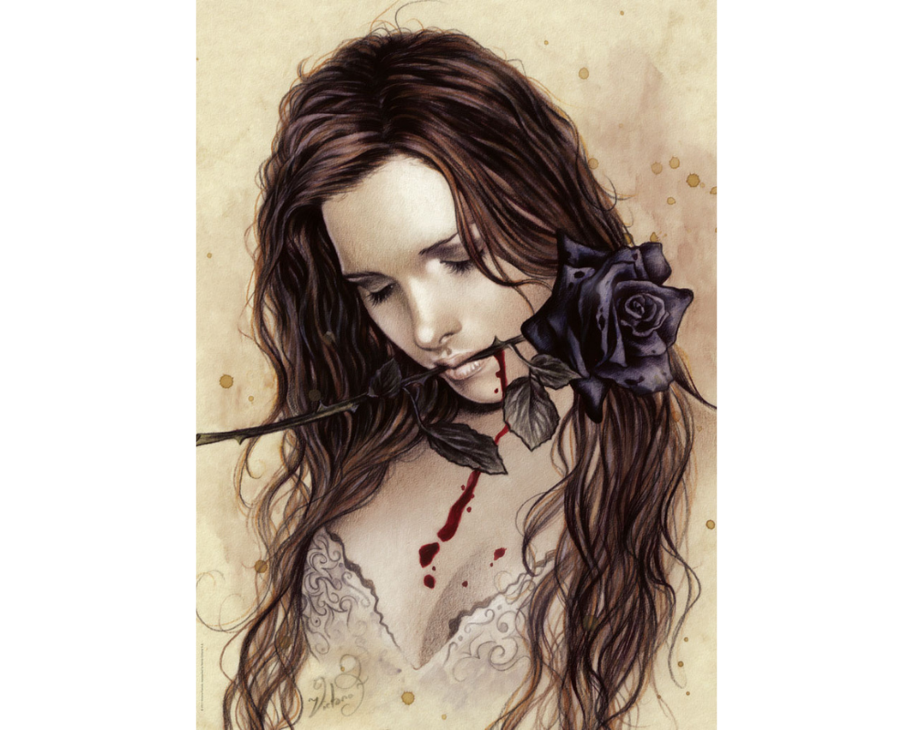 Explora el universo gótico y melancólico de la ilustradora Victoria Francés con esta obra de la colección Favole. La imagen destaca por su estética romántica y oscura, donde la delicadeza de la protagonista contrasta con una atmósfera de misterio, logrando una composición visualmente impactante y llena de detalles.