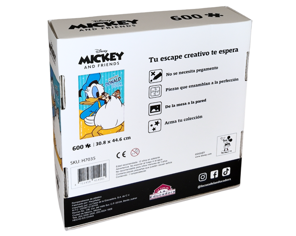 Revive la diversión y las travesuras clásicas de Donald junto a Chip y Dale con este rompecabezas de 600 piezas de plástico resistente, impresas en alta definición para capturar cada detalle de esta escena llena de humor y energía.