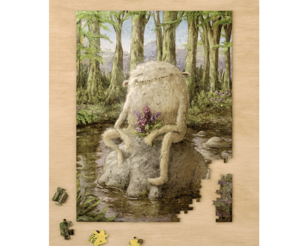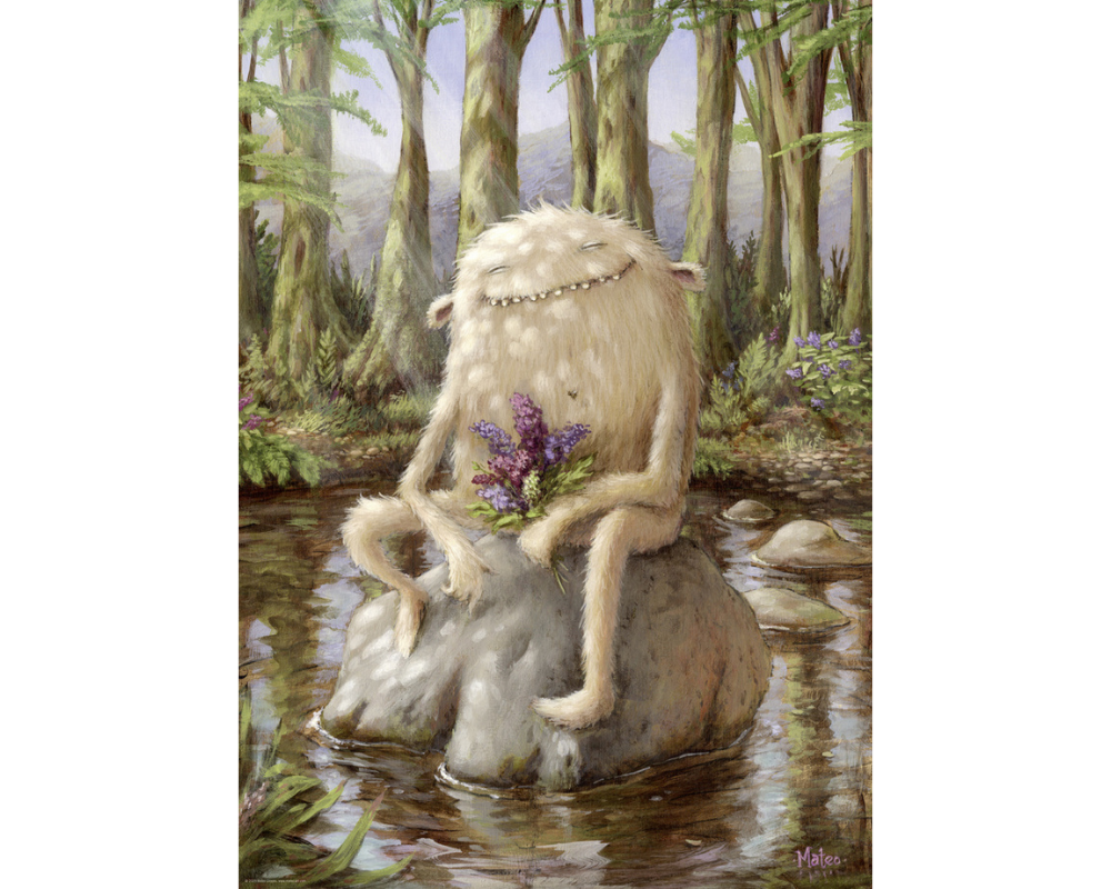 Disfruta del ingenio de la galería berlinesa Zozoville con esta divertida ilustración de Johan Potma y Mateo Dineen. La imagen presenta a uno de sus característicos y simpáticos monstruos en una escena entrañable, destacando por su humor visual y el estilo de texturas sobre materiales reciclados que define a esta colección.