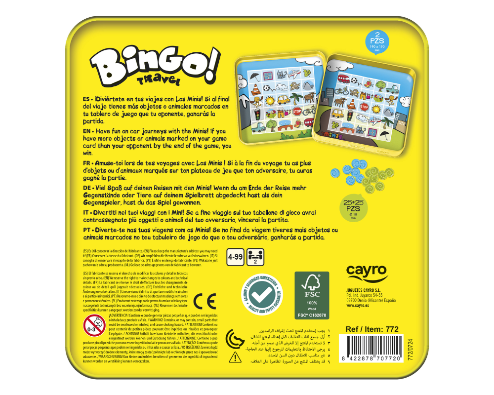 Este práctico juego de bingo de Cayro está diseñado para llevar la emoción del clásico bingo a cualquier parte. Su formato compacto y su caja metálica lo hacen ideal para viajes, reuniones familiares o tardes de juego espontáneo.