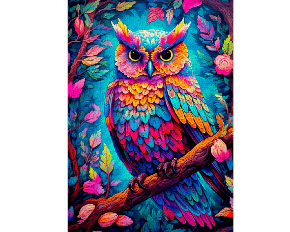 Un rompecabezas de fauna con un fuerte toque de arte moderno y psicodélico. El Búho de Colores de 1000 piezas se caracteriza por una paleta de colores hiper-saturados. El desafío se encuentra en la gestión de la alta saturación de color y la separación de los patrones creados por las plumas en contraste. La dificultad se traslada del troquelado al color.