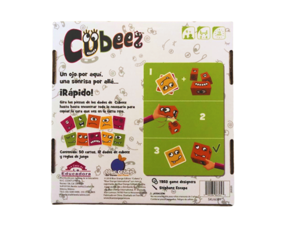 Cubeez es un juego de Velocidad, Observación y Destreza para varios jugadores. El objetivo es ser el más rápido en replicar la expresión facial (ojos, nariz, boca) mostrada en la tarjeta de desafío, utilizando y girando tres cubos de colores. Su dificultad es Media-Alta, ya que combina la rapidez para reconocer el patrón con la coordinación mano-ojo para manipular los cubos correctamente bajo presión.