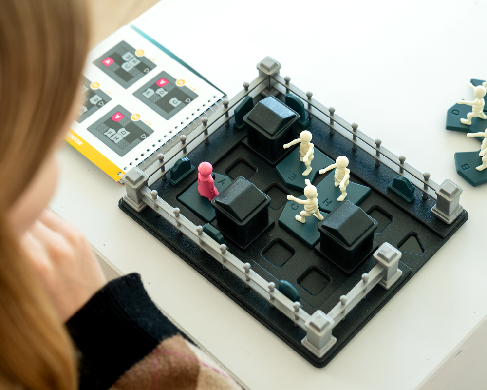 El objetivo del juego es ayudar a la niña y su gato a escapar del cementerio antes de que los esqueletos la atrapen. El desafío comienza con todas las piezas colocadas según el folleto. El jugador debe mover y rotar las piezas, una por una, a un espacio vacío adyacente para crear un camino seguro para la niña. Las tumbas son piezas que nunca se pueden mover. El resto de las piezas (esqueletos y la niña) se pueden deslizar o levantar y rotar en su sitio para que encajen en un espacio vacío. La pieza de la niña es la única que tiene una forma triangular especial que le permite encajar y salir por la ranura de escape del tablero, marcando la solución del desafío. Este juego requiere una planificación cuidadosa de los movimientos para manipular el tablero sin quedar atrapado por las figuras de los esqueletos.