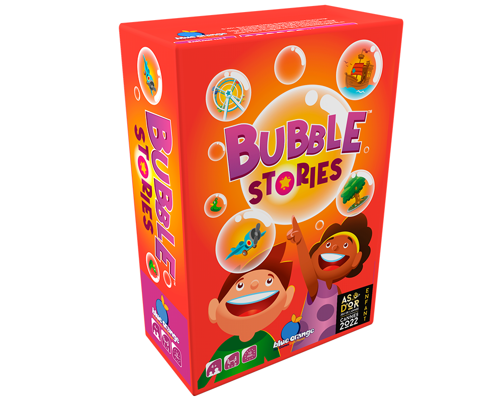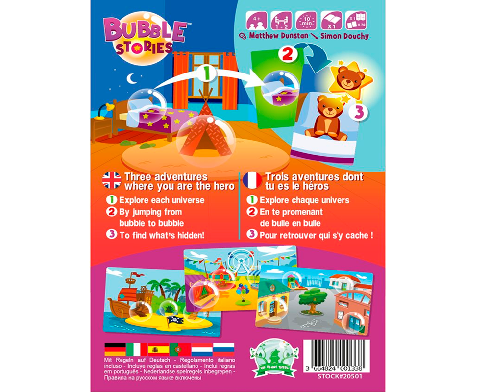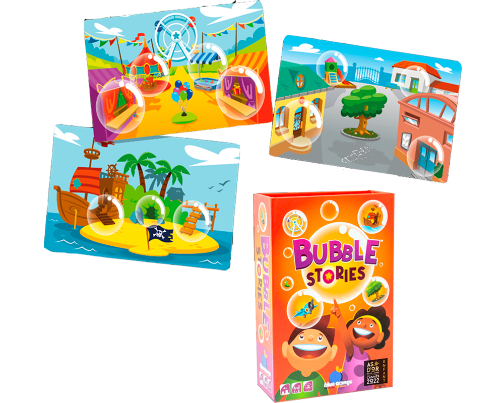 Bubble Stories es un juego de mesa infantil diseñado para 1 a 2 jugadores, con partidas de aproximadamente 10 minutos. Es ideal para niños desde los 4 años, ofreciendo una experiencia de exploración sin necesidad de texto.