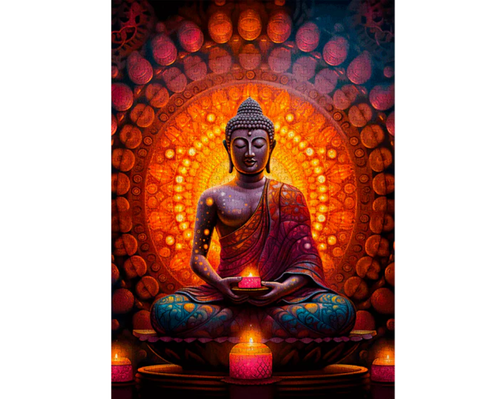 Este rompecabezas de 1000 piezas se centra en una imagen de Buda, con un estilo que puede ser el de una estatua o un mandala. El reto reside en la simetría y la repetición de patrones. La alta definición de la impresión es crucial para distinguir los detalles finos en el rostro y los pliegues de la ropa. El montaje exige una gran atención a la simetría.