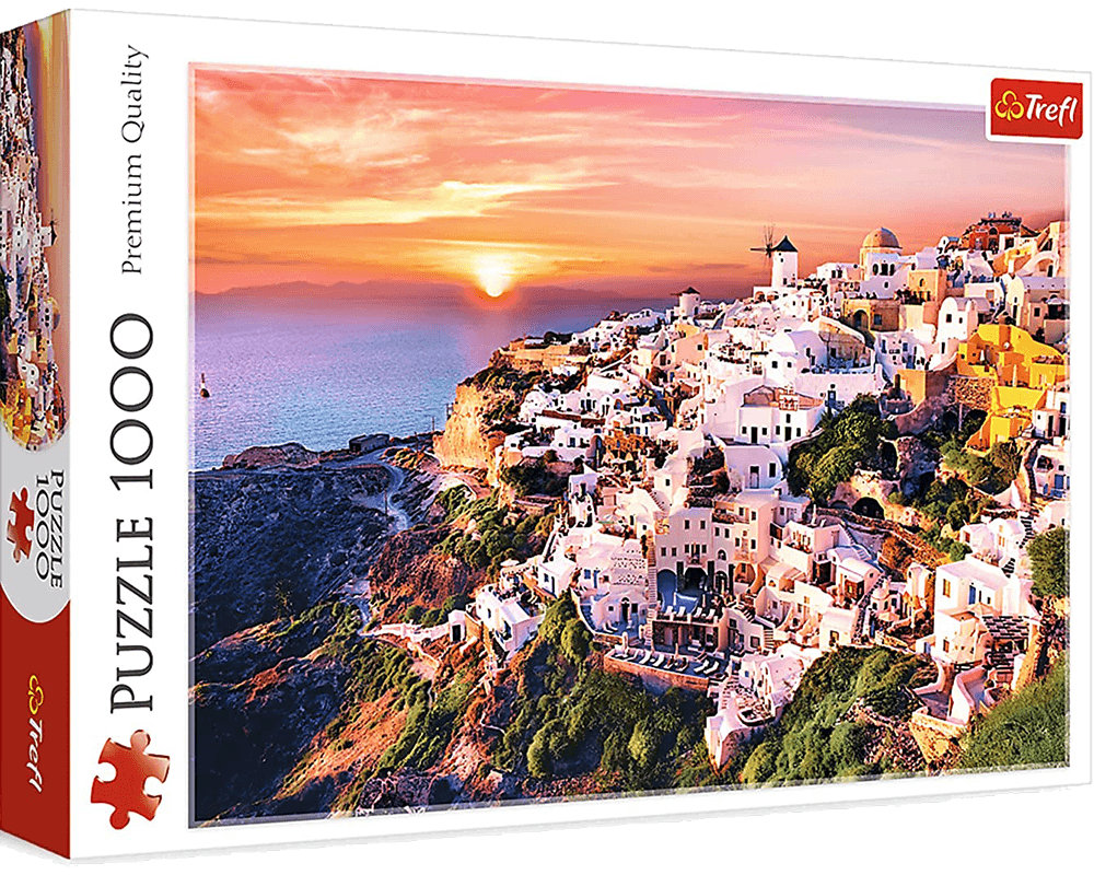 Rompecabezas Puesta de Sol sobre Santorini – Trefl (1000 piezas) Sumérgete en la belleza de Santorini con este rompecabezas de 1000 piezas de Trefl. La imagen captura una impresionante puesta de sol sobre la arquitectura blanca y azul característica de la isla, transportándote a un destino de ensueño mientras ensamblas cada pieza.