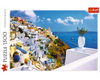 Captura la belleza icónica de las islas griegas con el rompecabezas Santorini de 1500 piezas de Trefl. La imagen destaca el contraste entre las casas blancas, las cúpulas azules y el mar Egeo.