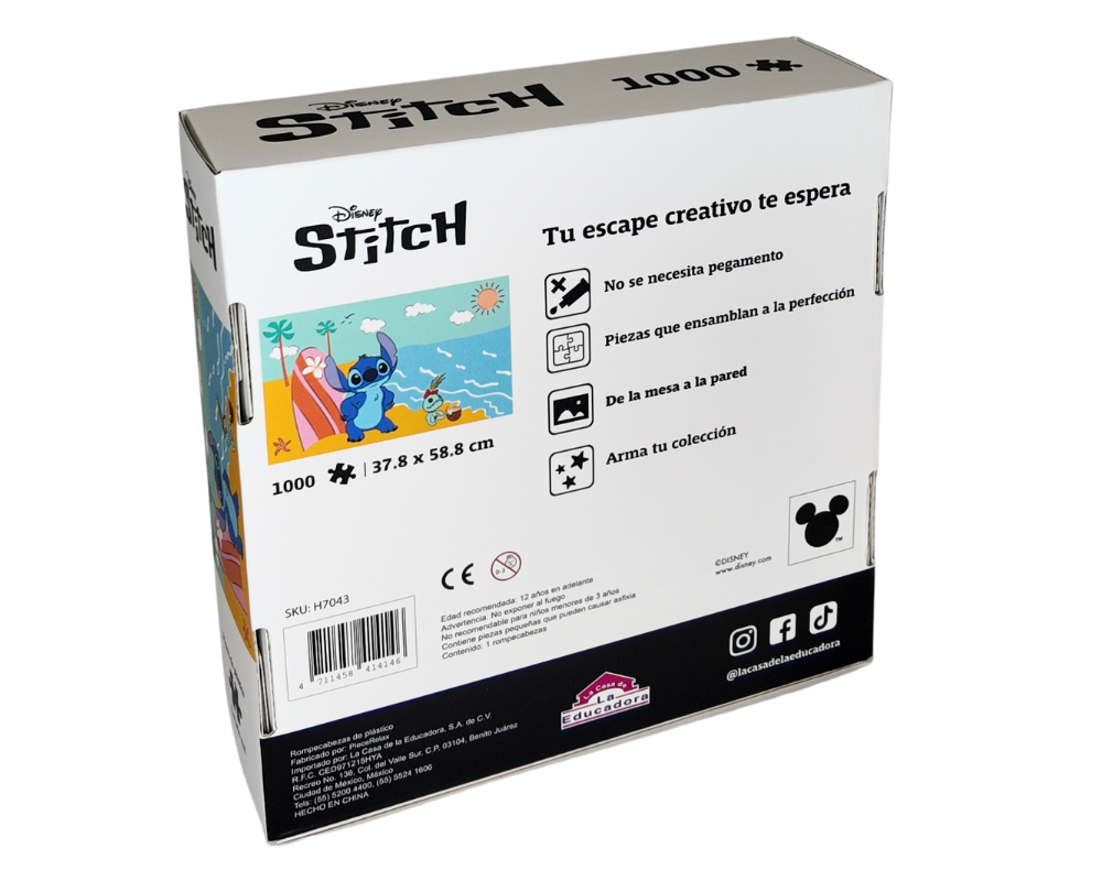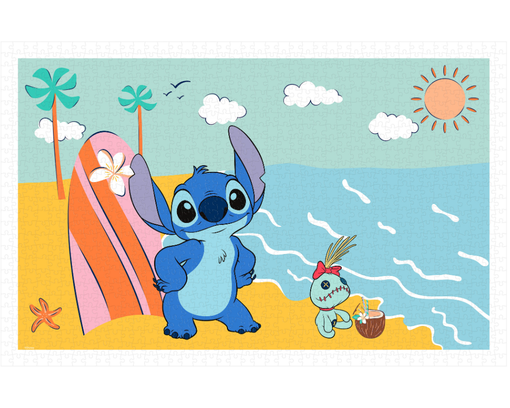 Disfruta la energía y ternura de Stitch en una escena playera llena de color con este rompecabezas de 1000 piezas de plástico resistente, impresas en alta definición para capturar cada detalle del personaje más travieso de Disney.