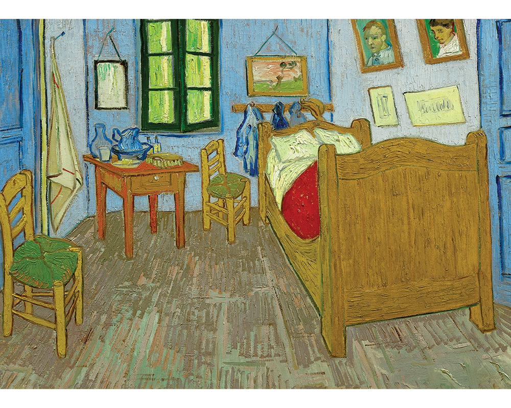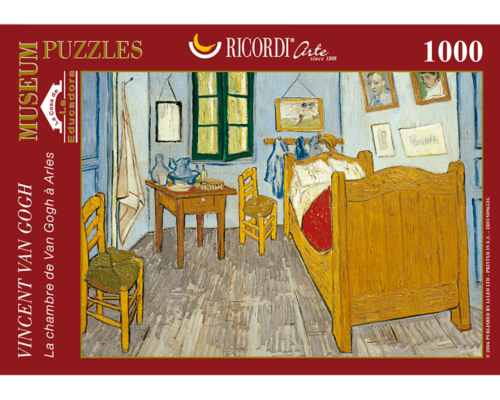 Van Gogh - La Recámara es un rompecabezas de Ricordi, ideal para los amantes del arte y los desafíos visuales. Con 1000 piezas, este puzzle permite recrear la icónica obra El dormitorio en Arlés, una de las pinturas más reconocidas de Vincent van Gogh.